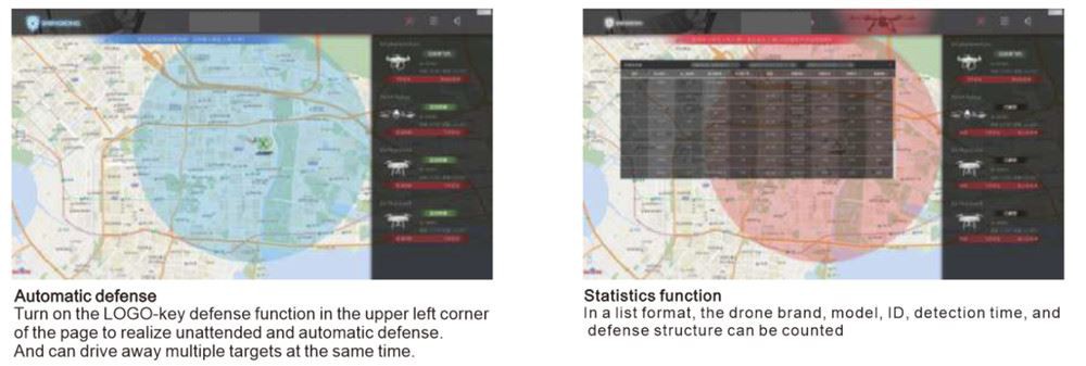 A behatoló drónokhoz a következők közül választhat: Egy-billentyűs automatikus védelem: A rendszervédelmi funkció aktiválása után a behatoló drónt a rendszer automatikusan védi, szolgálatot teljesítő személyzet nélkül; Manuális beavatkozás: Manuálisan kiválaszthatja, hogy megvédi-e bármelyik drónt, és hogyan kell védekezni az időre, vagy megszakítja a védelmet, és kiválaszthatja a pilóta helyét.